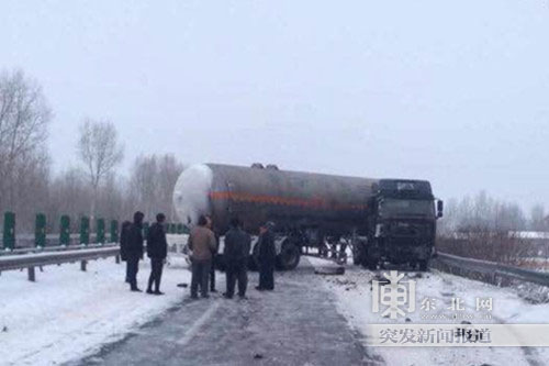 哈大高速一油罐车与一黑色面包车相撞(图)
