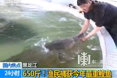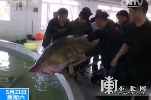 东北网22日讯 据央视网消息,20日上午,黑龙江省抚远县渔民在江中捕获一条大鳇鱼。经过水产部门的检测,确认这是今年春渔期间捕获的最大的一条鳇鱼,巨型鳇鱼被放入饲养池。