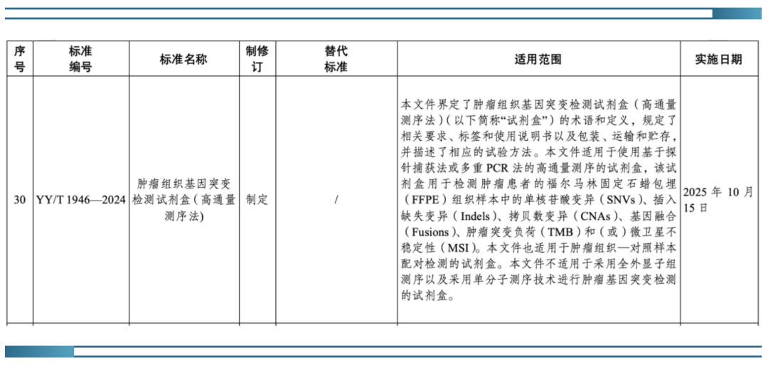 近日,国家药监局发布2024年第120号公告,《肿瘤组织基因突变检测试剂盒(高通量测序法)》(YY/T 1946—2024)行业标准,通过国家药监局审查,正式批准发布,并将于2025年10月15日正式实施。该标准由多家单位共同参与,吉因加作为牵头方。