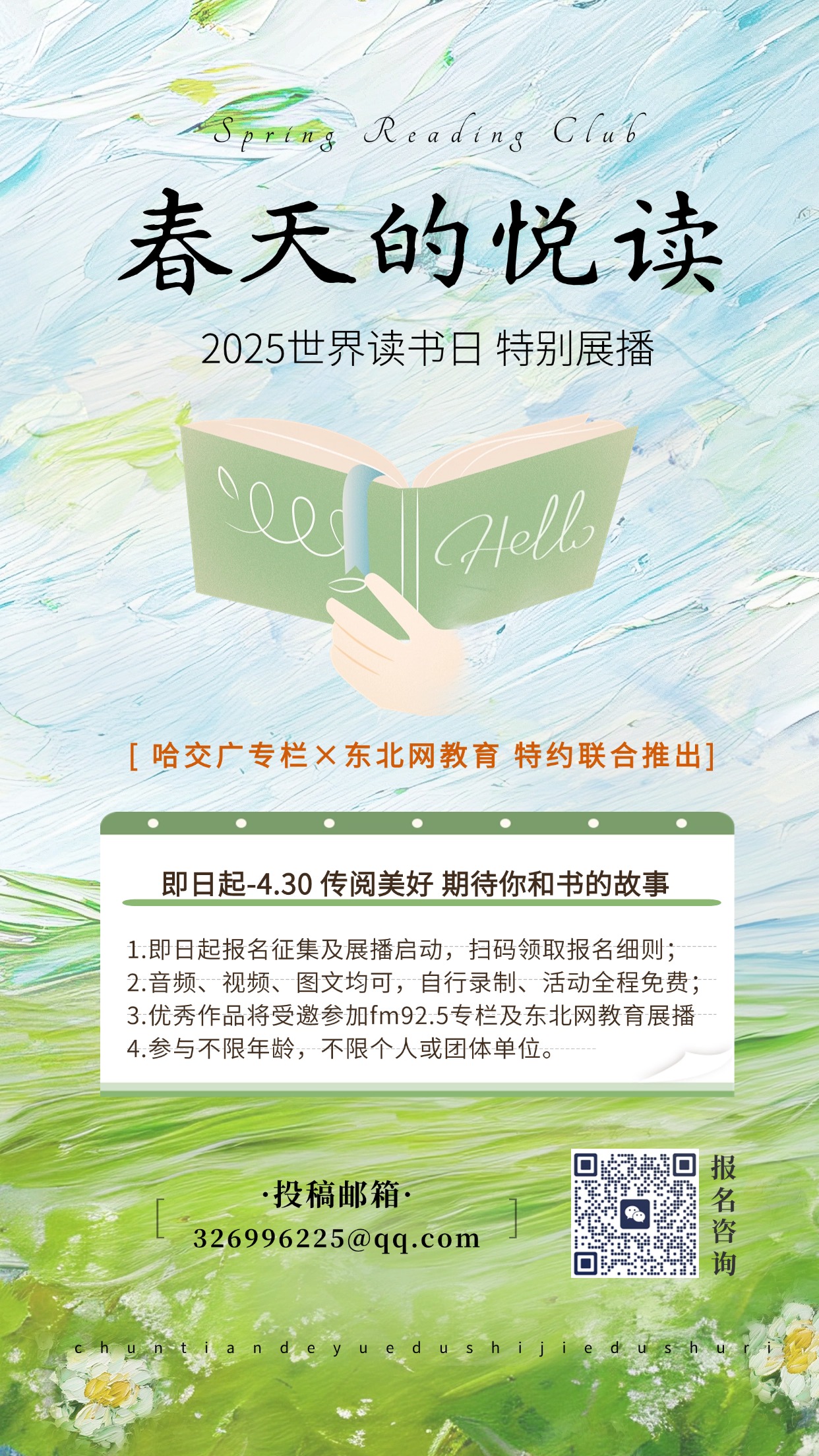 春色漫卷,字句生香。每一页翻动的声音,都是时光的私语;每一行文字的驻足,皆是成长的注脚。在2025年世界读书日来临之际,由东北网教育与哈交广专栏节目联合发起的“Spring Reading Club——春天的悦读”特别展播活动温情启幕。即日起至4月30日,诚邀每一个与书相伴的灵魂,以声音、影像或文字,镌刻阅读的痕迹,让书香成为岁月里永不褪色的扉页。